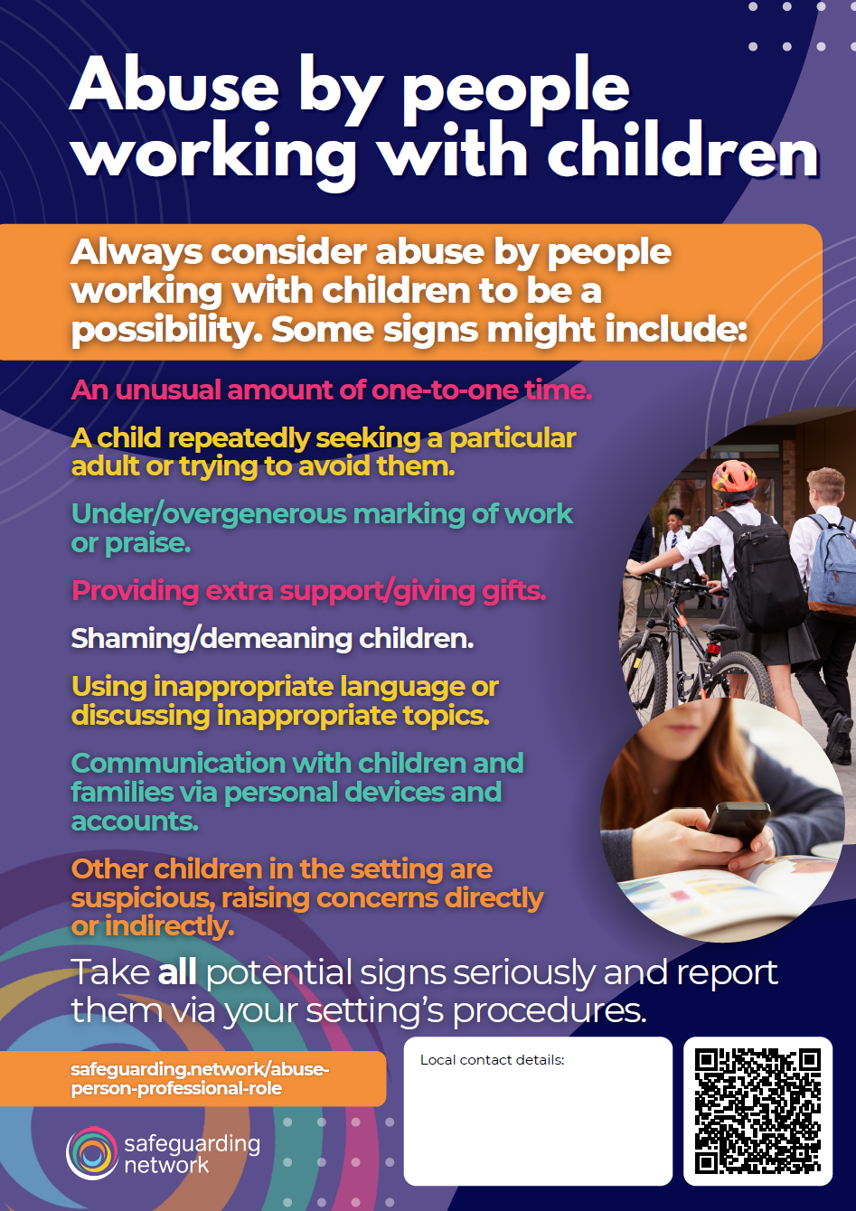 This downloadable resource raises the profile of safeguarding for your staff team. For use in staff rooms, on safeguarding boards or on the back of toilet doors, the poster includes tips, a space for local contact details, plus a link and QR codes to this resource page. Download the poster from the resources below.